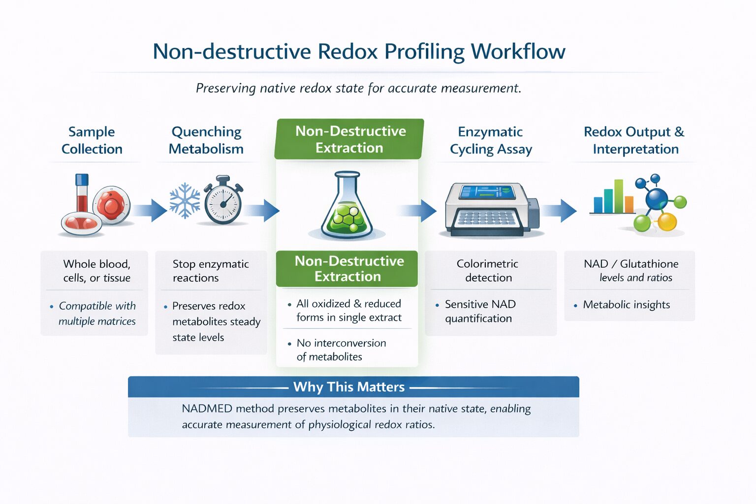 The NADMED method is designed to ensure high reproducibility and analytical accuracy, particularly for reduced metabolites that are inherently unstable. Early stabilization combined with non-destructive extraction minimizes artifactual shifts in redox state during sample handling.